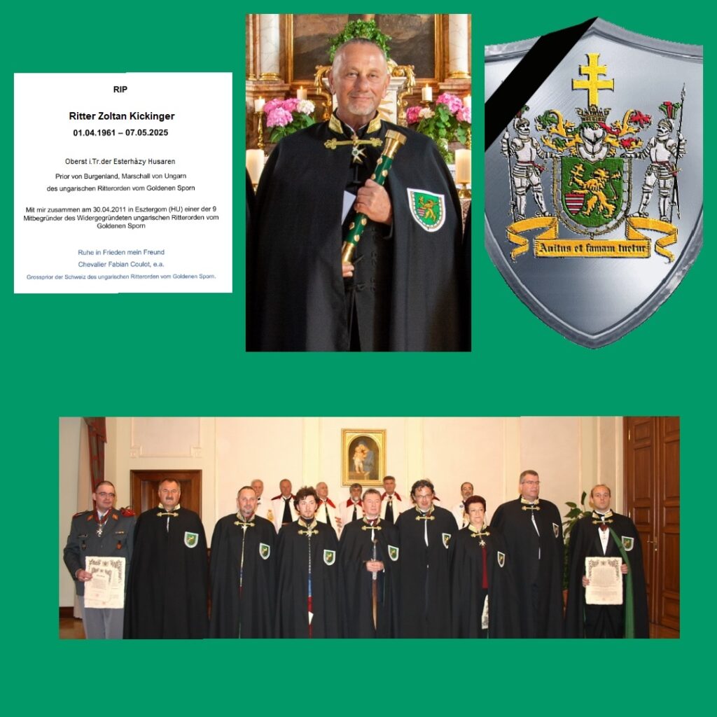 Gute Reise lieber Freund. Schweren Herzens haben wir die trautige Mitteilung erhalten, dass Ritter Zoltan Kickinger in seinem 64. Altersjahr zu seinem himmlischen Vater berufen wurde. Am 01.04.1961 in Budapest (HU) geboren, verstarb er am 07.05.2025 im Kreise seiner Liebsten. Seine Leidenschaft waren unter anderem die Pferde. Er war der erste Rittmeister der „Esterhazy Husaren“ Im Jahre 2011 war er auch einer der Gründer des wiedergegründeteten Ritterorden vom Goldenen Sporn.