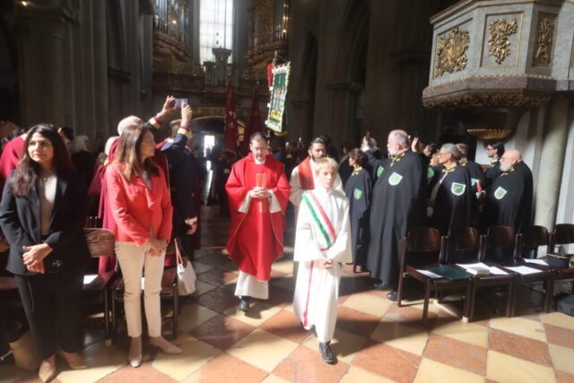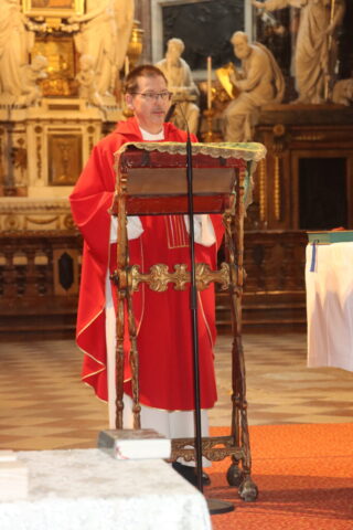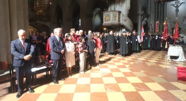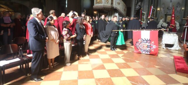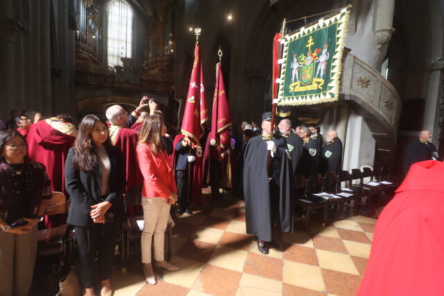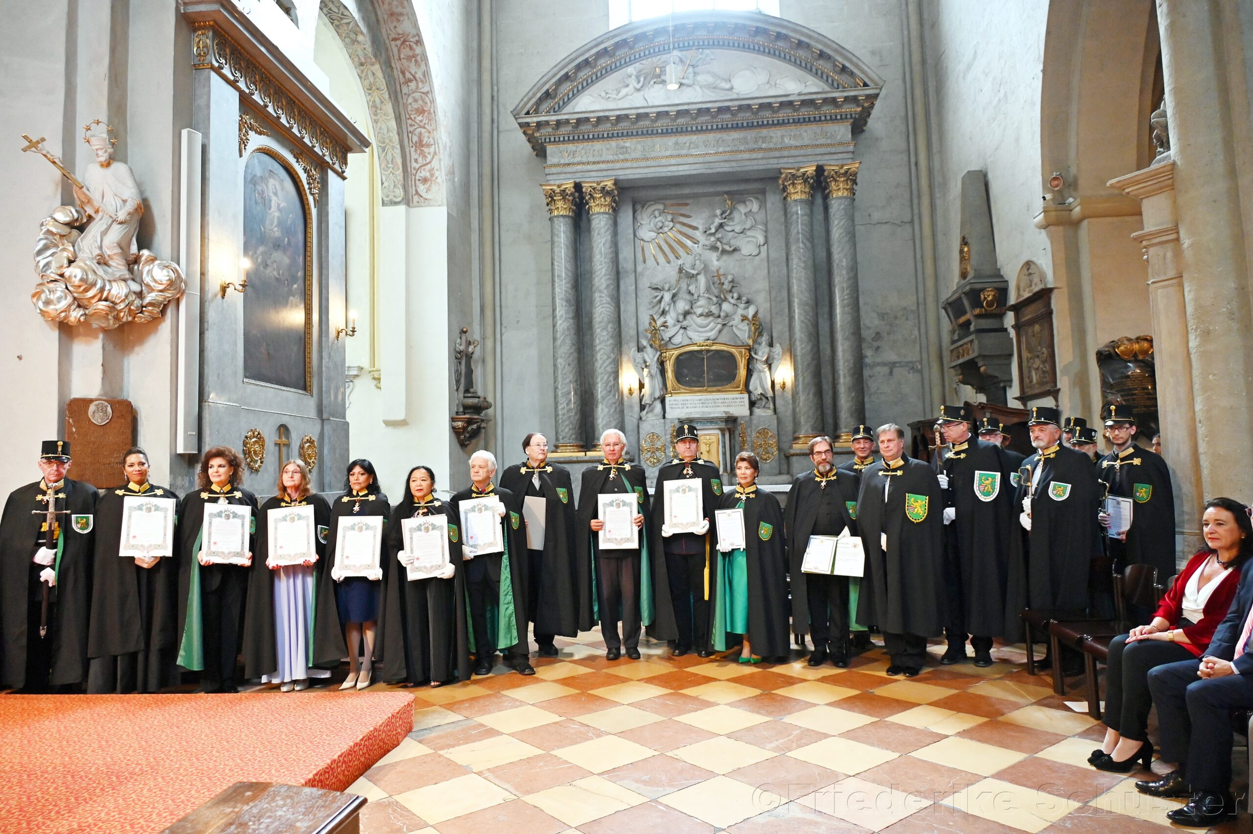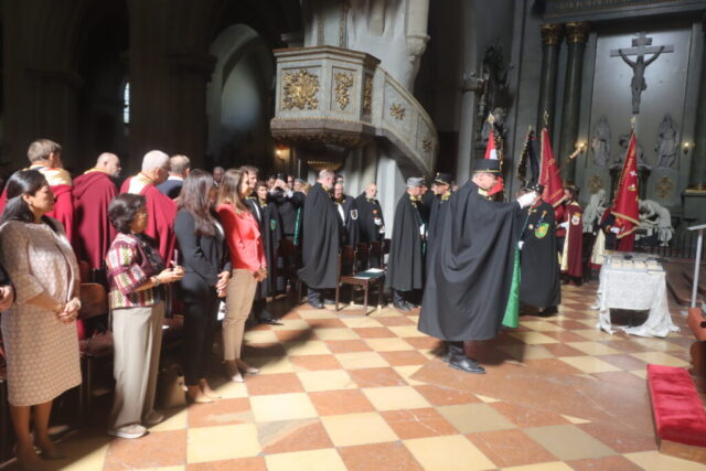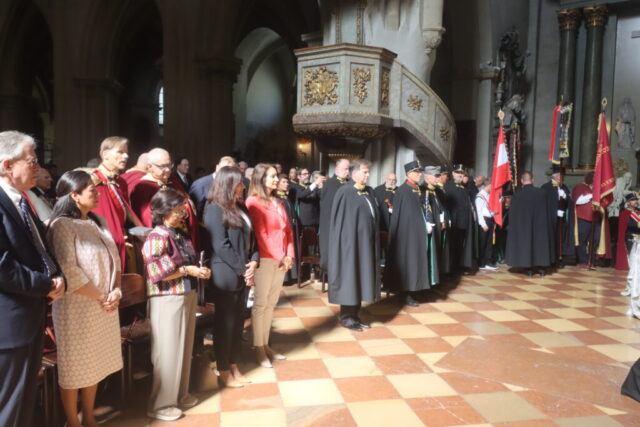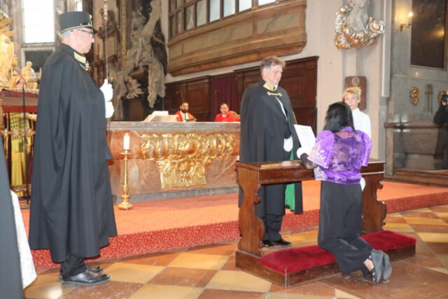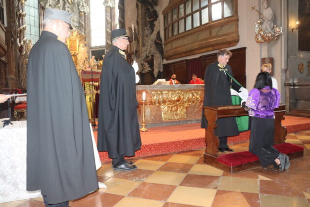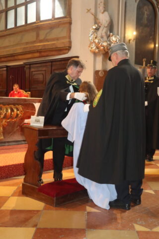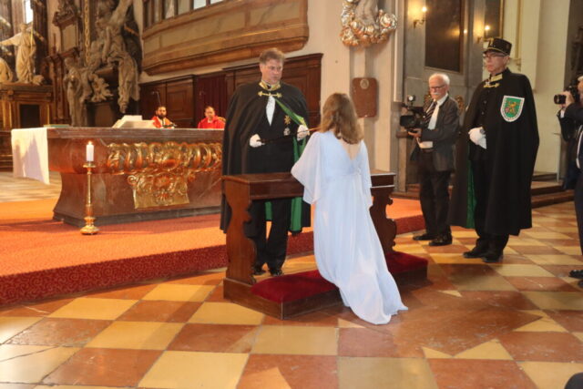 Dann folgte der ergreifendste Moment der Zeremonie: Die Aspirantinnen und Aspiranten wurden einzeln vor den Altar geführt, sprachen kniend ihre Gelöbnisformel und empfingen den symbolischen Ritterschlag durch das Schwert des Großmeisters. In dieser ehrfurchtgebietenden Geste verband sich Geschichte mit Gegenwart, und die erhabene Stille der Kirche ließ die Bedeutung dieses Schrittes für jeden Einzelnen spürbar werden.